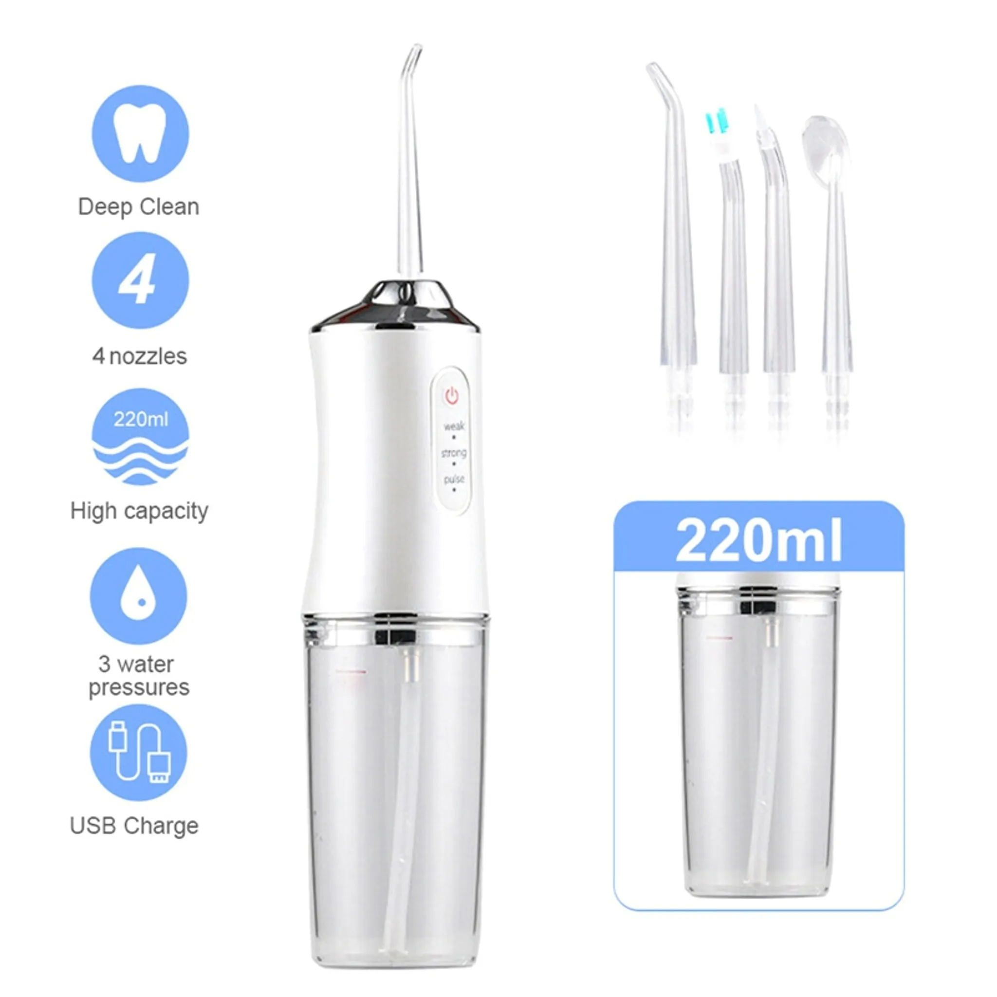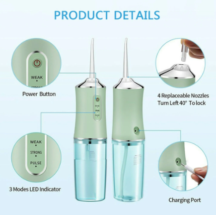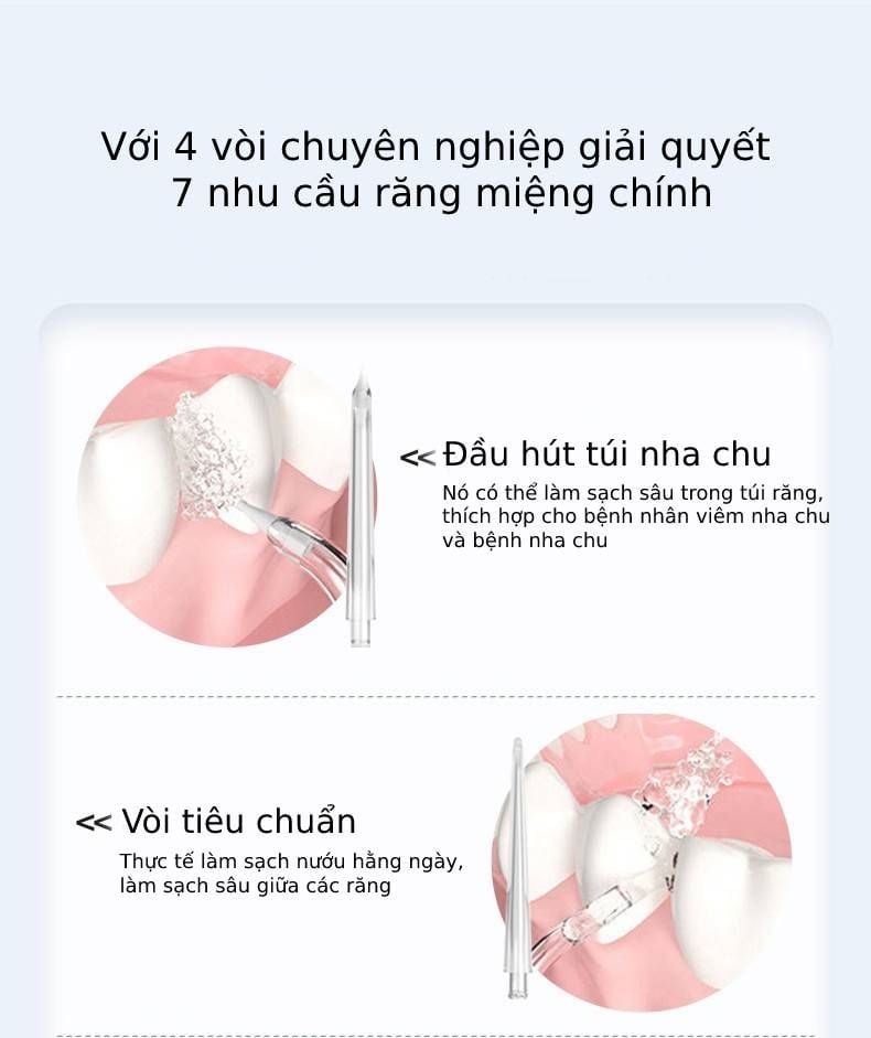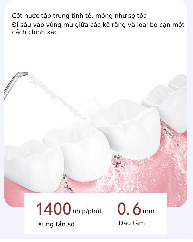 - Sản phẩm tăm nước vệ sinh chăm sóc cho răng miệng toàn diện, dễ dàng loại bỏ thức ăn thừa, đánh bay vết bẩn và mảng bám cứng đầu