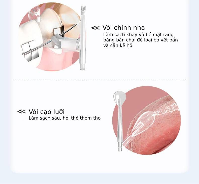 Tia nước đi sâu vào từng kẽ răng, đánh bật mảng bám, massage nướu, vệ sinh chân răng và làm sạch những lớp cao răng mới mà không gây thưa răng, không gây ra các bệnh răng miệng như tăm tre hay chỉ nha khoa.